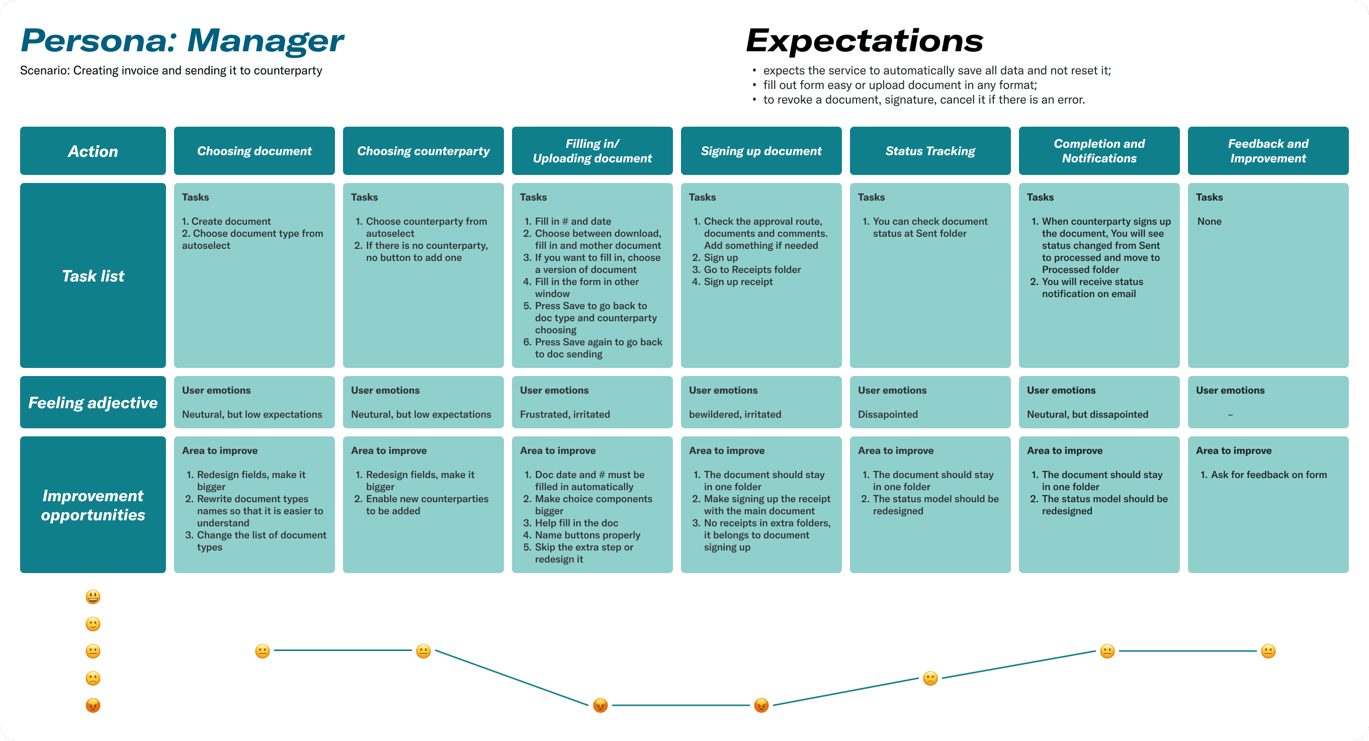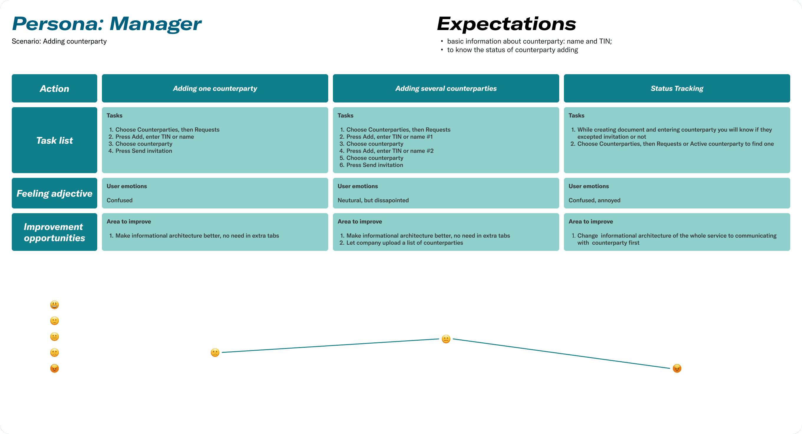 Service’s navigation system was transformed, setting a new standard beyond its original design and distinguishing it from our competitors. Inspired by the ’messenger vs. mail’ concept, I’ve arranged all counterparties in a handy left-hand panel. This layout allows users to smoothly choose who to send documents to or receive documents from.