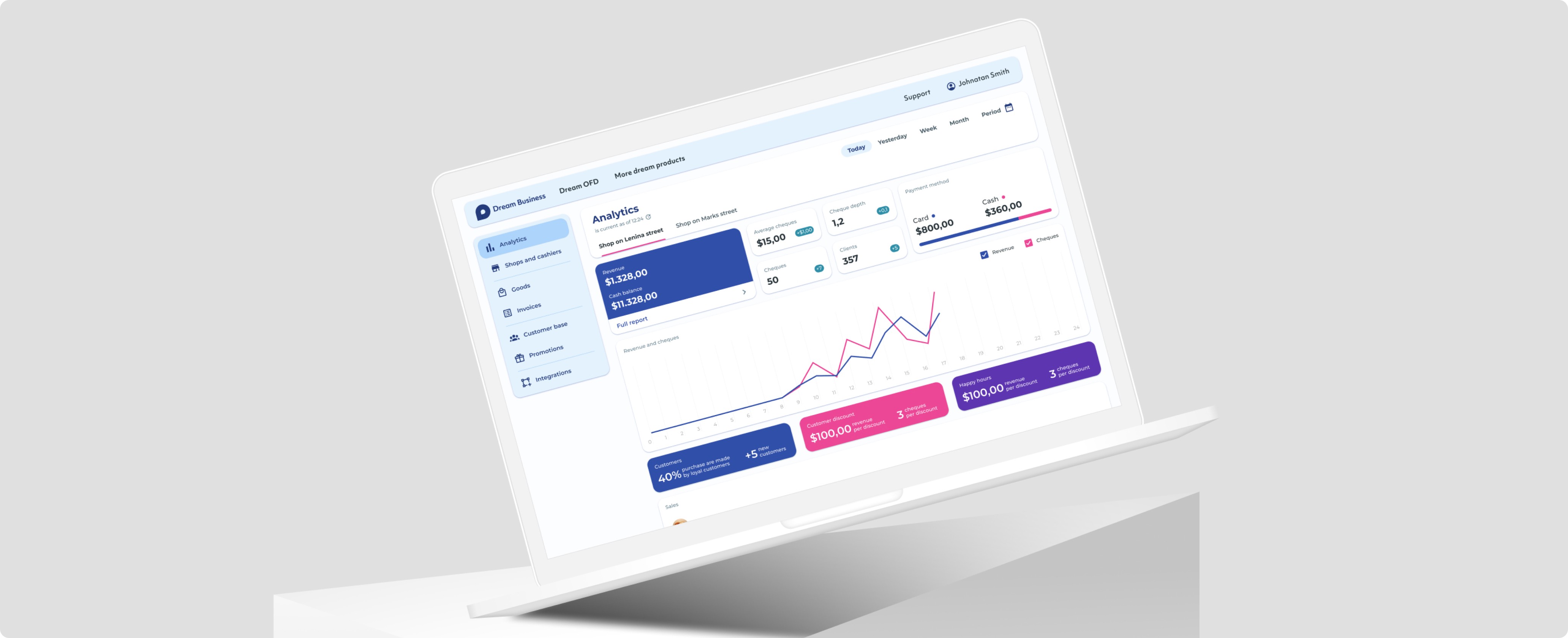 We categorized key business metrics into four quantitatively measurable areas: number of loyal customers, number of cheques, average cheque, and cheque depth. For each metric collected through the checkout process on the cash register, we provide various marketing strategies to enhance them. These include loyalty programs, ’buy one, get one’ promotions, gifts with purchase, sales, and more. Business owners can tailor the discount amount, products, and promotion dates to their specific needs, while we assist in gathering data to evaluate the success of these promotions.
