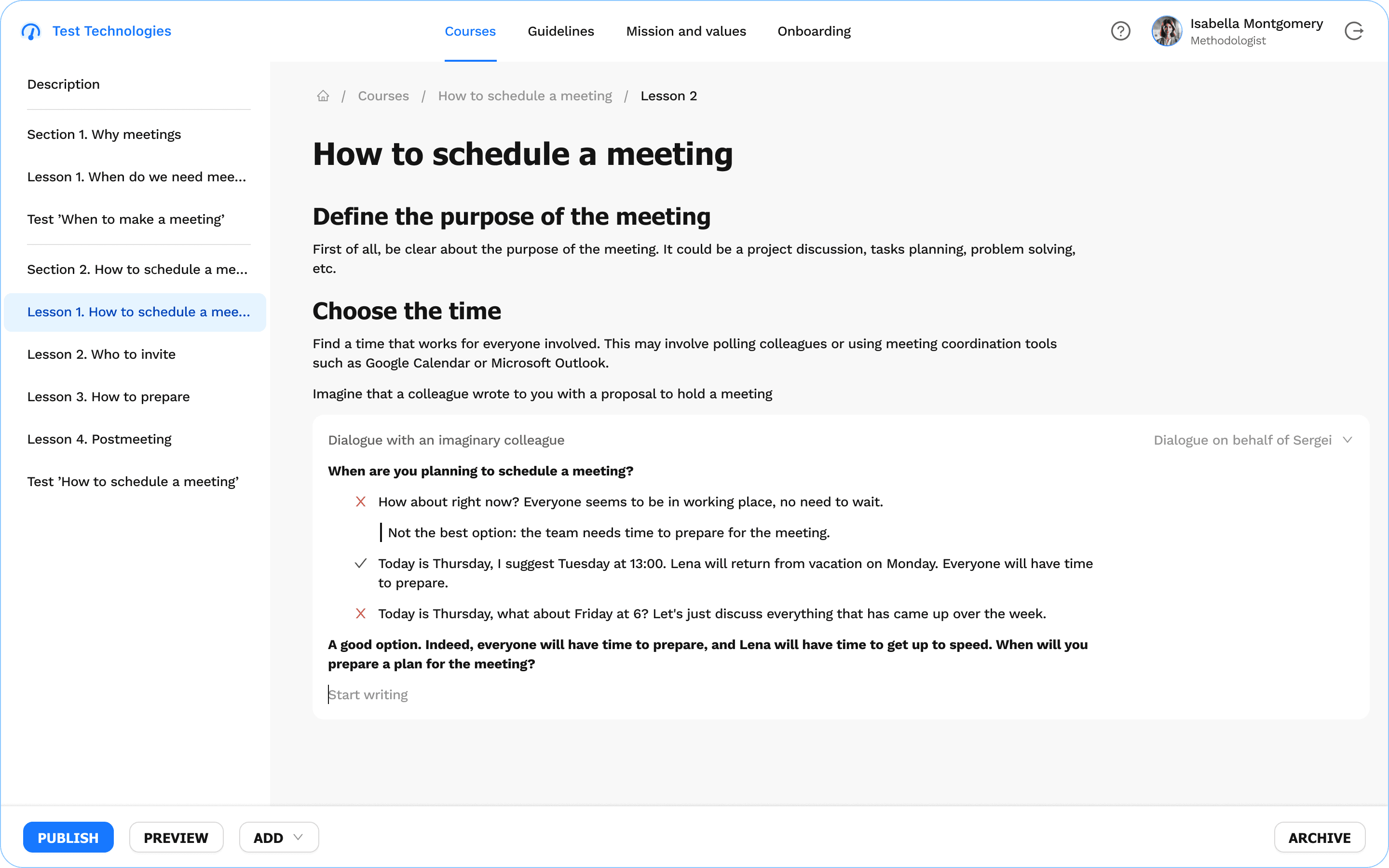In the online learning service, one of the types of tasks is dialogues with imaginary colleagues. In them you need to choose the right answers so that the conversation is constructive and achieves its goal. The task is to come up with and design an admin panel for these dialogs.