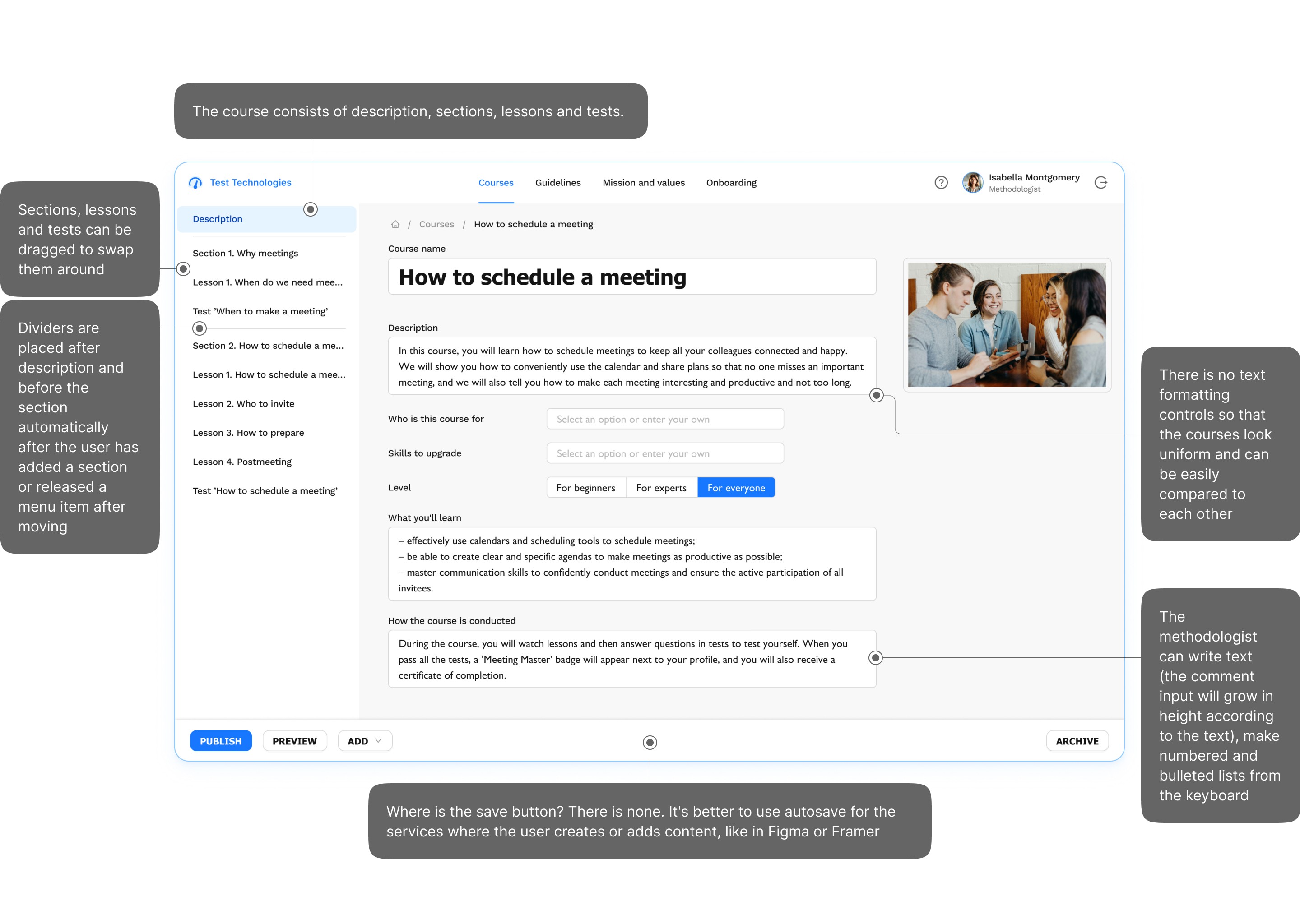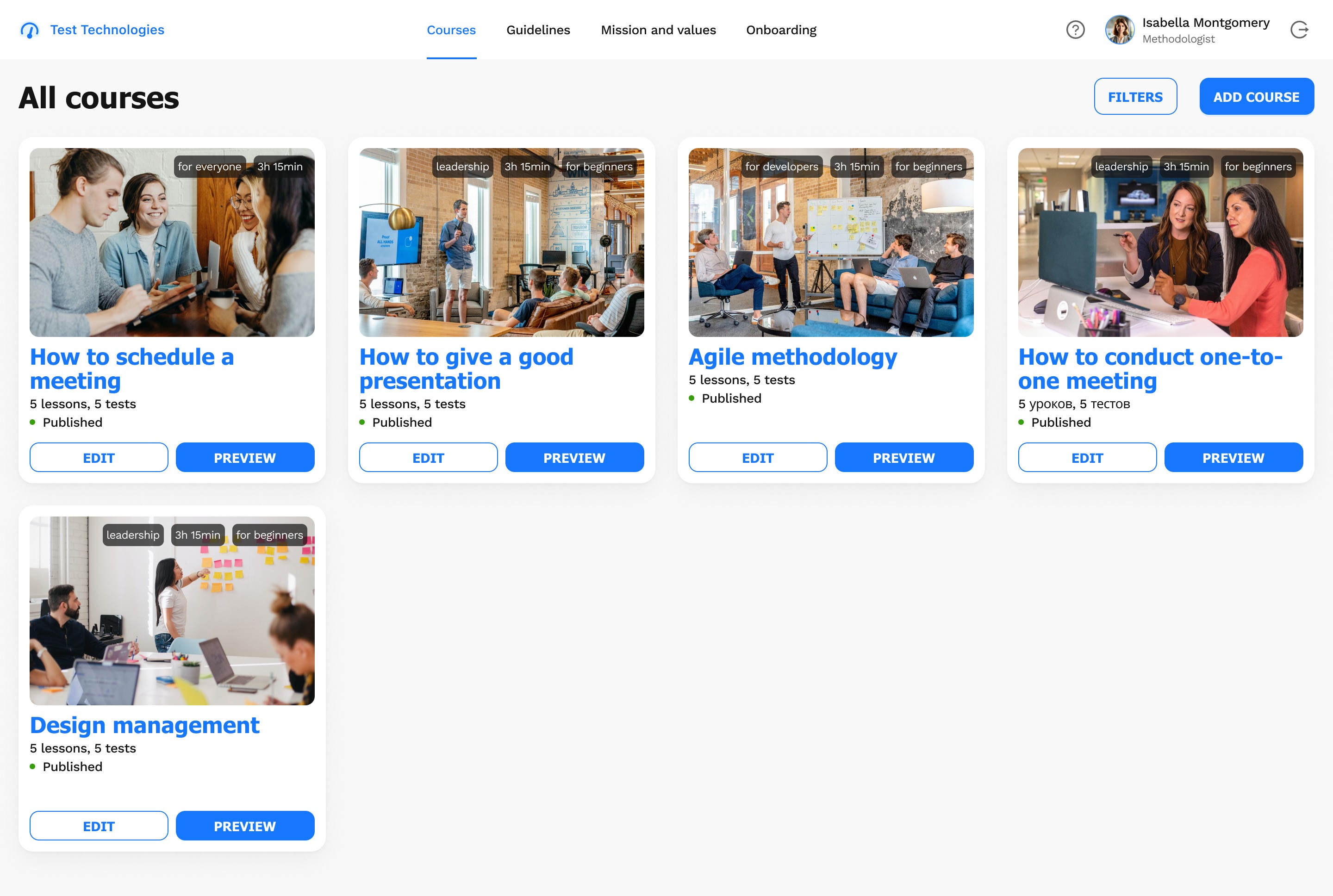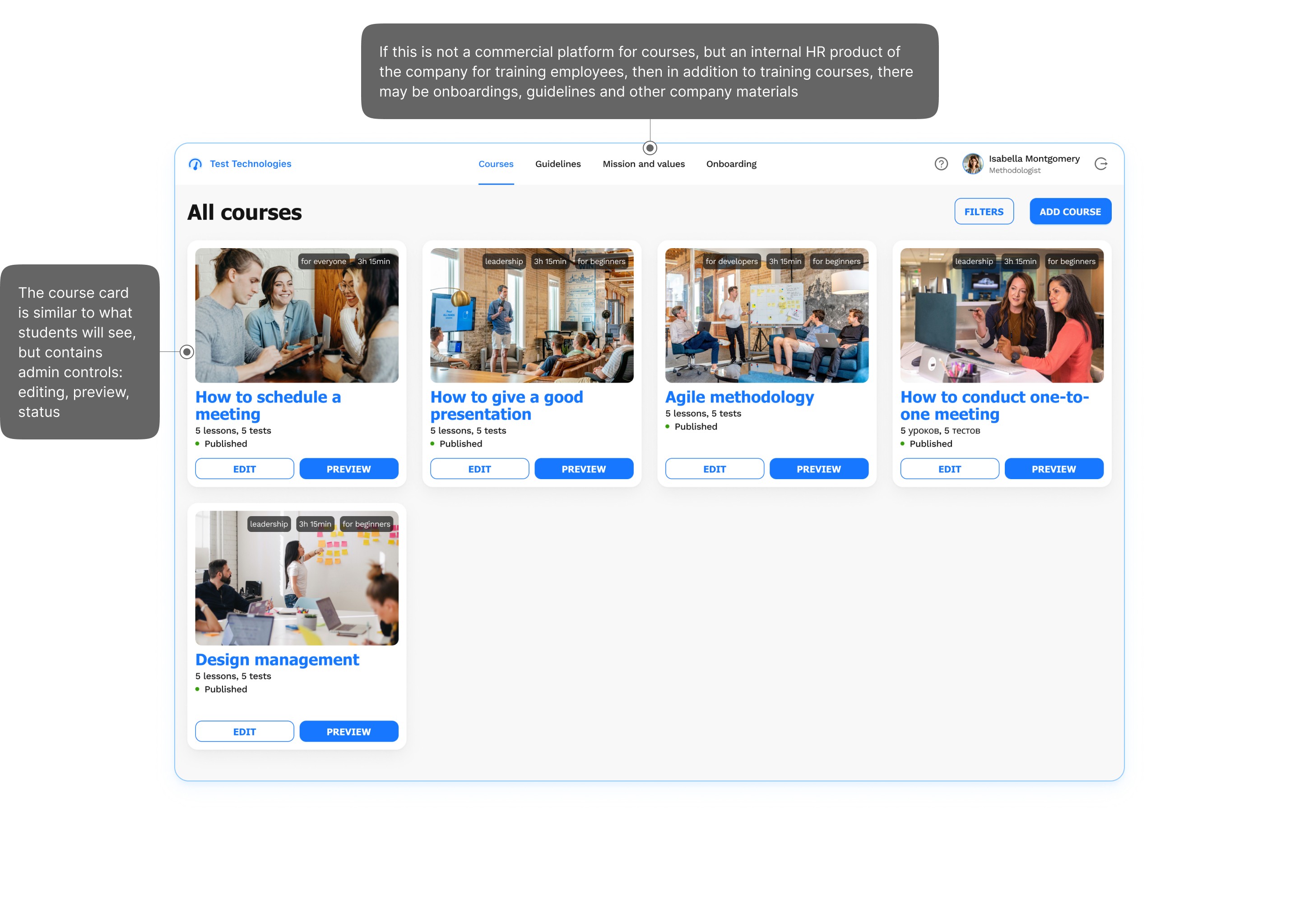 I assume that this is an internal service of a specific company, where courses on hard and soft skills are posted, as well as exercises, tests and simulators for practicing them, and not a large training platform for commercial courses, so that it is clear why I am like this chose this information architecture